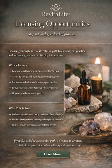 • Foundational training in Quantum Bio Therapy™ principles and application • Guidance on integrating this work into your existing services or business model • Access to self-paced learning materials and virtual support • Opportunities for deeper learning through in-person or advanced sessions as available • Preferred access to RevitaLife® apothecary products for a fully integrated approach • Ongoing guidance and support as you grow within the framework